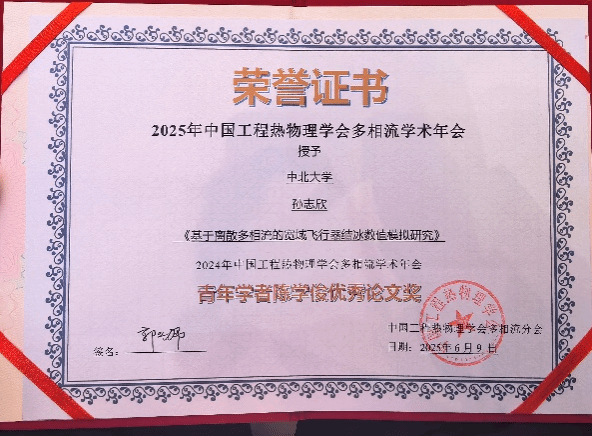 值得庆贺的是,学院光热技术团队孙志欣硕士的学术论文《基于离散多相流的宽域飞行器结冰数值模拟研究》,凭借扎实的理论基础、创新的研究方法及重要的应用价值,在众多参评成果中脱颖而出,荣获2025年中国工程热物理学会多相流学术年会“青年学者陈学俊优秀论文奖”。这一荣誉不仅是对孙志欣硕士个人学术能力的高度认可,更是学院在人才培养与科研创新工作上取得的重要成果,彰显了学院在多相流研究领域的学科优势。