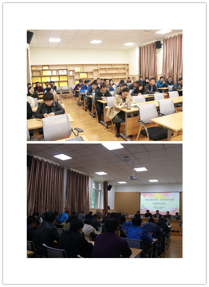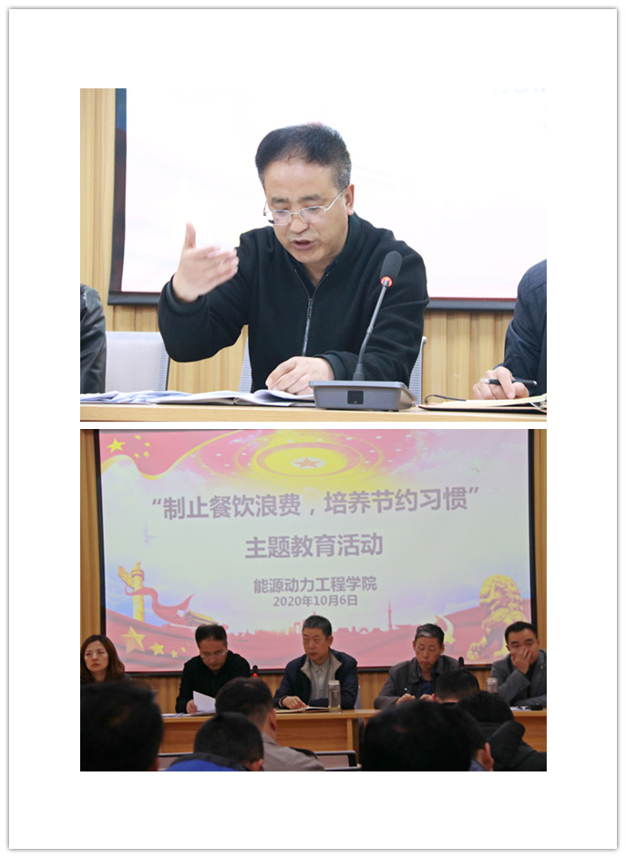 2020年10月6日下午3:30,能源动力工程学院在诚学楼115学术报告厅举行“制止餐饮浪费,培养节约习惯”主题教育活动。会议由院党委书记李运芝主持,学院领导班子和全体教职员工参加了会议。