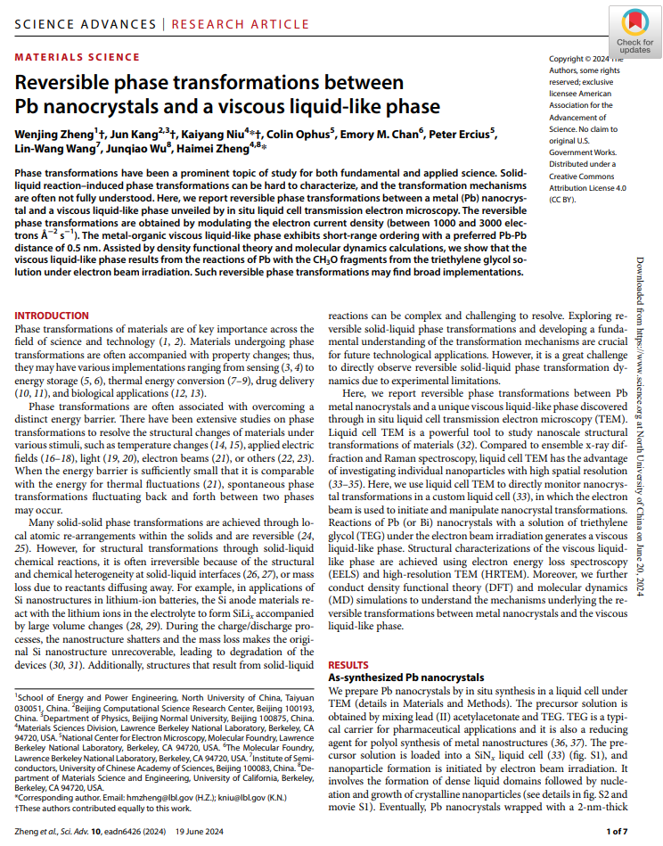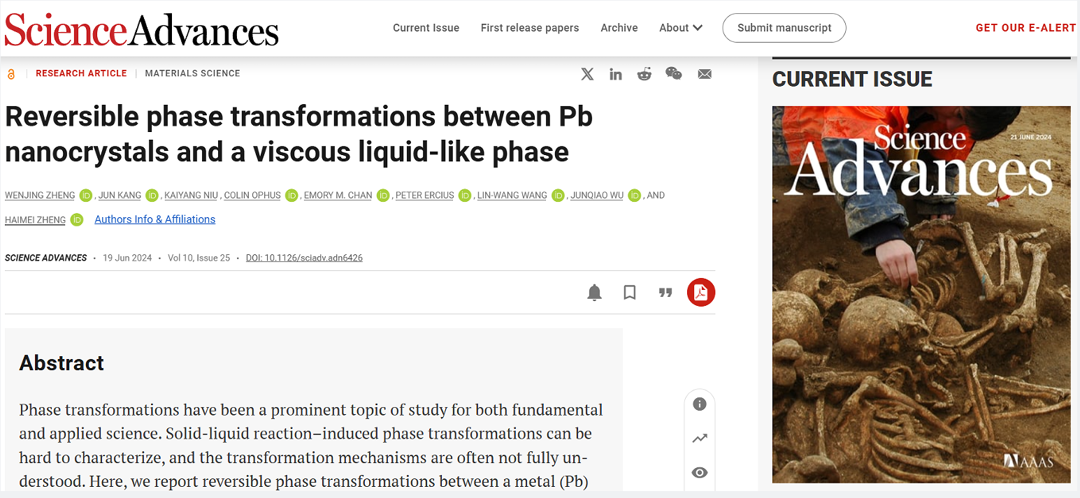 6月19日,我院郑文静老师在国际顶级综合性学术期刊《Science Advances》发表了题为“Reversible phase transformations between Pb nanocrystals and a viscous liquid-like phase”的学术研究成果(Science Advances, 2024, 10(25): adn6426)。该研究成果由我校与北京计算科学研究中心、北京师范大学、中国科学院大学半导体研究所、美国加州大学伯克利分校、美国劳伦斯伯克利国家实验室合作完成。中北大学为第一单位。