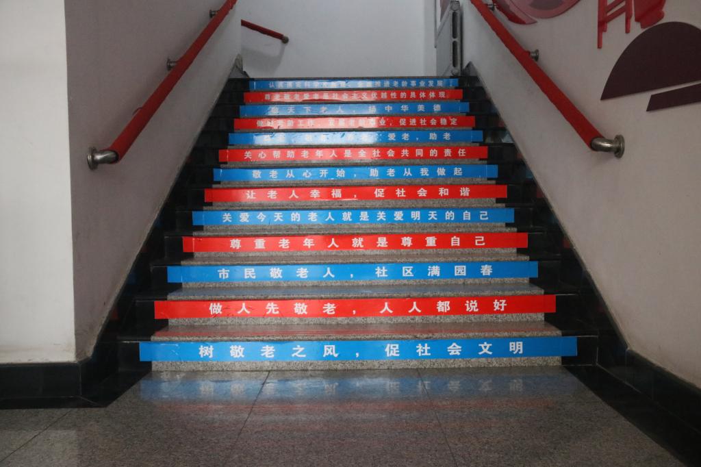 志愿活动由学院党建办公室和青志部联合开展,经过前期征集标语,筛选标语,广泛宣传动员等环节,活动正式开始。首先离退休人员管理处韩文剑老师做动员讲话,随后志愿者们开始工作,大家分工明确,各司其职,将标语整齐美观的张贴在67层台阶上。标语体现了离退休处“尊老爱老敬老”,“老有所养,老有所乐”以及“发挥预热,增添正能量”的工作、服务理念。