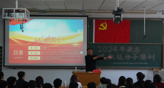 人文社会科学学院党委书记孙俊伟以《入党手续及文书写作》为题,向学员们详细介绍了入党流程与入党所需材料的书写要求,并告诫学员们一名合格的党员应当做到“真心诚意、尽心尽力、没有二心”,让学员们对党的严明纪律与优良的作风有了更加深刻的认识。