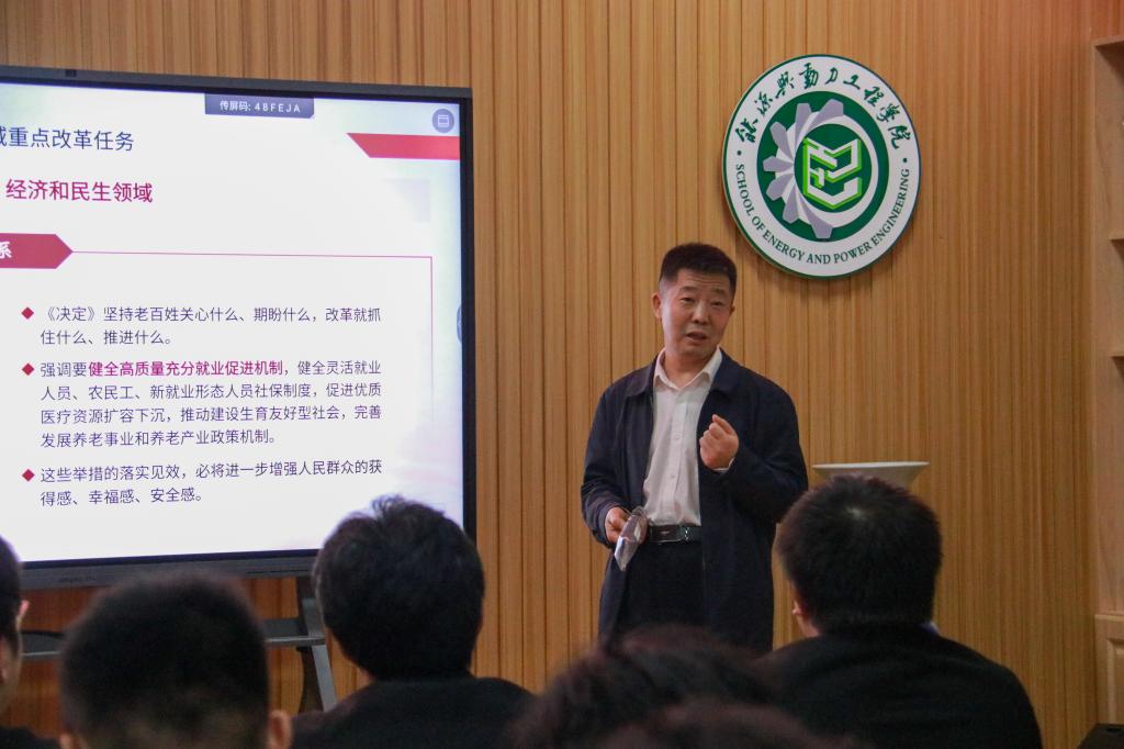 能源与动力工程学院党委书记胡向明围绕《学习贯彻党的二十届三中全会精神专题铺导报告》进行讲解,强调学员们要坚定不移听党话、跟党走,不断增强“四个意识”、坚定“四个自信”、做到“两个维护”,要努力学习知识,注重理论与实践相结合,发挥自身专业特长,以真才实学服务人民,以创新创造贡献国家,让青春在强国建设、民族复兴的火热实践中绽放绚丽之花。