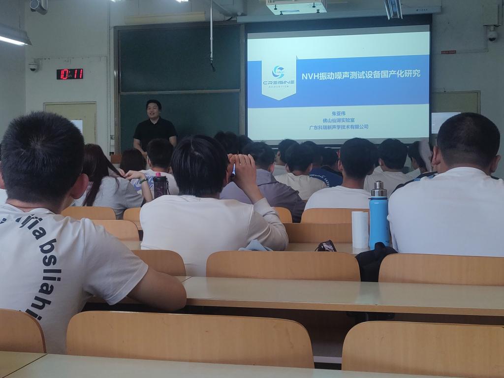 2025 年 5 月 19 日上午,新能源汽车产业学院特邀企业导师、优秀校友 ——广东科瑞新声学技术有限公司创始人兼总经理朱亚伟,为车辆工程专业研究生及本科生开展主题授课与交流活动。作为打破国外仪器设备技术垄断的行业先锋,朱亚伟校友以 “技术攻坚・创业实践・职业赋能” 为脉络,分享了从学术研究到产业创新的进阶历程,为师生带来一场兼具深度与温度的行业盛宴。