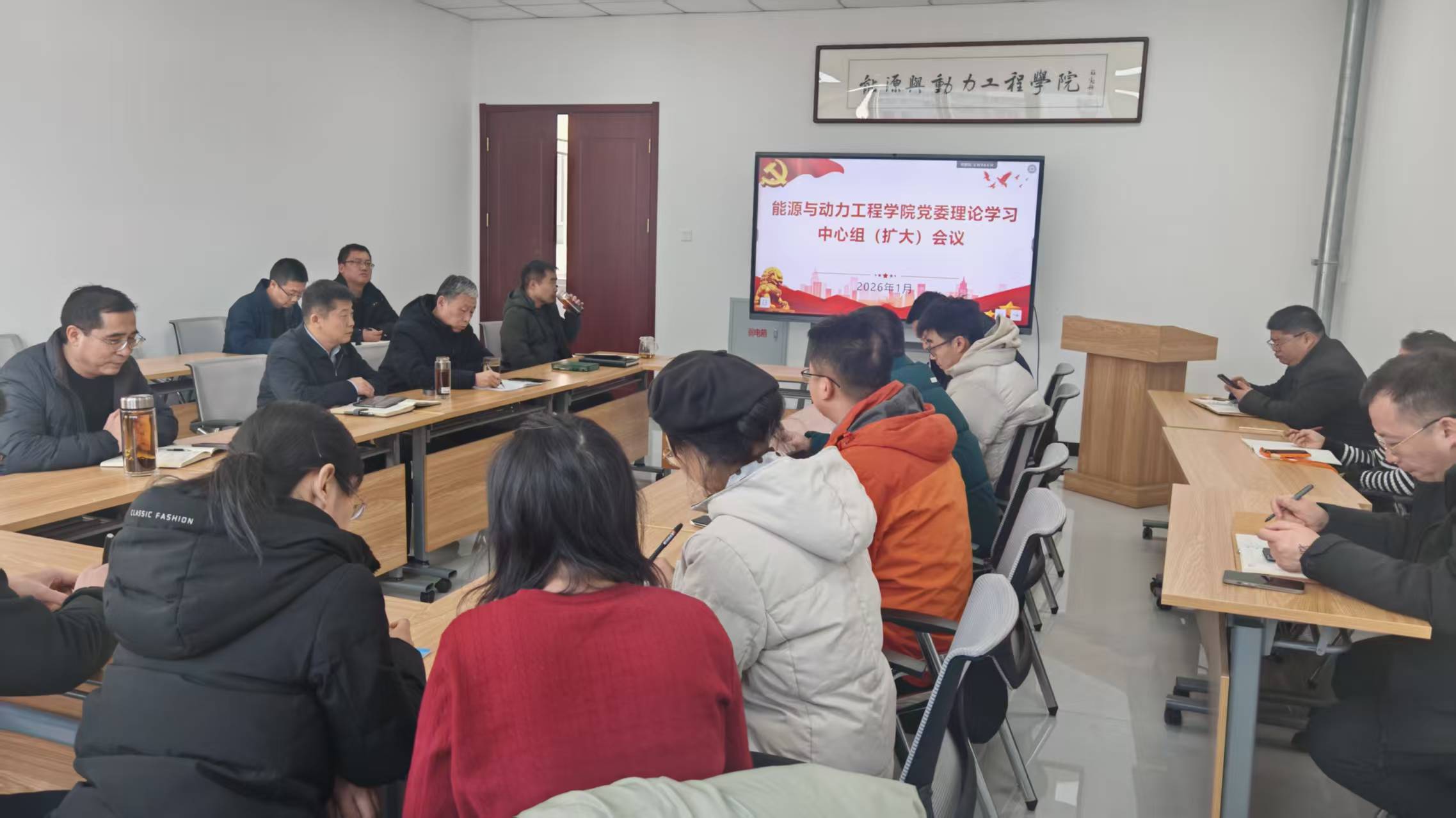 2025年12月23日,能源与动力工程学院党委在A203会议室召开党委理论学习中心组扩大会,专题学习《中共山西省委关于制定国民经济和社会发展第十五个五年规划的建议》,深入解读规划核心要义,结合学院学科特色与发展实际,研究部署贯彻落实举措。学院党委中心组成员、各党支部书记、团队负责人、各科室参加会议,学院党委书记胡向明主持会议并讲话。