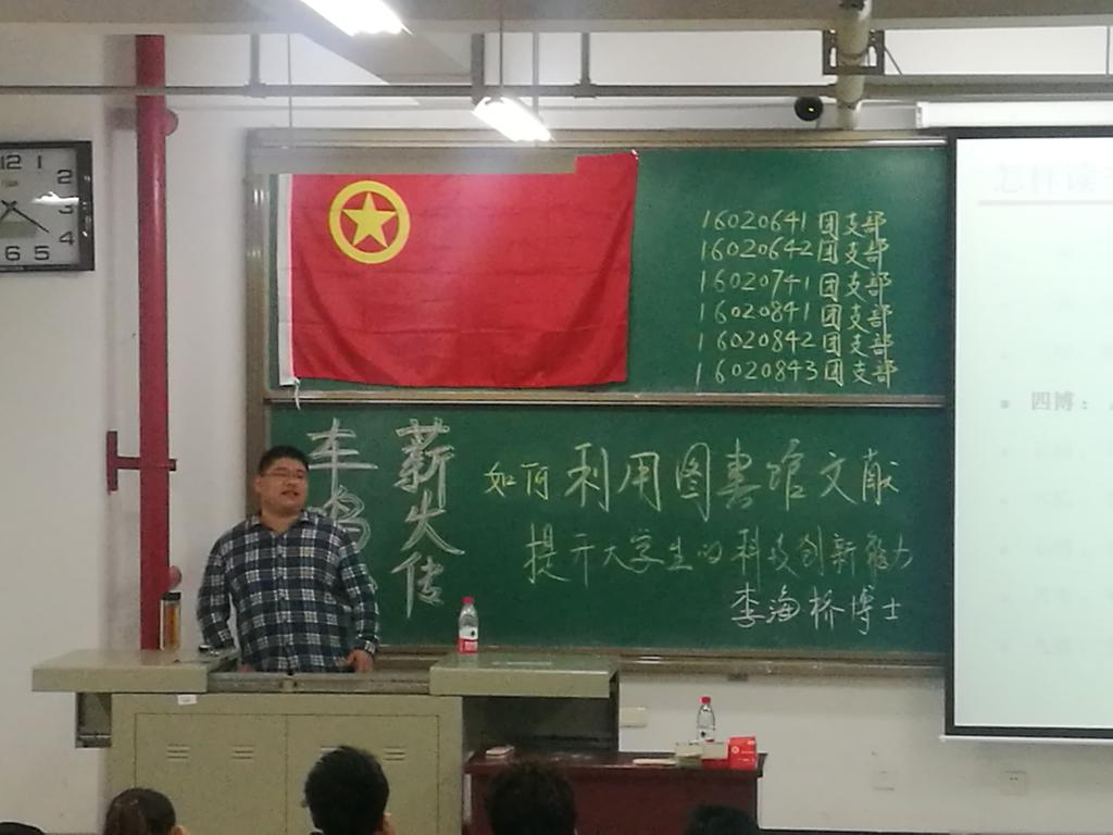 为深入学习贯彻落实习近平新时代中国特色社会主义思想,发挥社会主义核心价值观的引领作用,培育担当民族复兴大任的时代新人,弘扬实现中华民族伟大复兴中国梦的强大正能量,树立“全团抓支部”的工作导向,16020843团支部于3.30日晚7:30联合我院16级全体团支部 召开关于“如何提升大学生科技能力”的名为“车鸣起,薪火传”的讲座,为此有幸请到了李海桥博士。讲座的核心围绕“读书”与“文献”展开,鼓励同学们多读书,读好书,同时博士学长不吝赐教关于文献的搜索方法及论文的写作技巧,内容丰富多彩。所谓“开卷有益”,多读好书,百益无一害。
