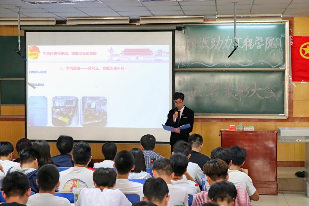 在庄严的团歌过后,院党委书记李运芝老师寄语青年学生,引经据典,向我们的青年们强调了自律、努力、奋斗对于成功的重要意义,并对同学们提出几点希冀:希望同学们能够牢记五四精神,做有梦想、有追求、有家国情怀的青年模范。接着,院团委书记李晓彧老师以“举旗铸魂 立德树人”为主题汇报了过去一年里我院团委工作的情况和取得的成就。随后,院党委副书记兼副院长赵永娟老师宣读了此次大会受表彰的集体和个人名单。其中,获奖的优秀团支部和个人展示了他们靓丽的风采和优秀的表现,给青年树立了榜样,激励着青年向标兵看起,做杰出共产主义青年。之后,同学们观看五四表彰视频,在榜样的力量中感受和传递五四精神。并且,五四红旗团支部和十佳团日活动团支部就团支部的各个方面工作展现了团日活动的开展情况和团支部的建设以及所取得的成就。在充满激情与斗志的氛围中,院团委副书记王敏妍带领同学们重温了入团誓词。最后,校团委副书记刘玉巍老师进行了总结讲话。她向能动学院的同学们表达了节日的祝福,肯定了能动学院团委工作的成就,并向我院学子能够继续传承和发扬五四青年精神,做新时代的有为青年寄寓了浓厚的期望。