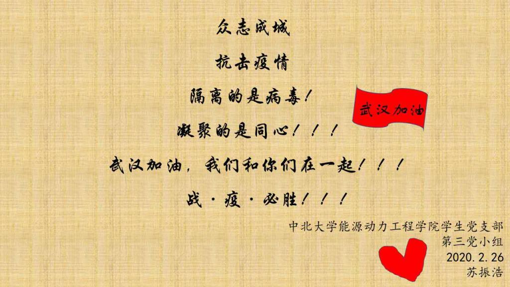为进一步贯彻落实我校疫情防控工作的精神,提高党员的党性修养,发挥党员的先锋模范带头作用,能源动力工程学院党委号召广大党员同志通过各种不同的形式积极开展防控工作,并组织各党支部于2020年2月下旬至3月上旬相继开展了“同心战疫,党员先行”的线上主题党日活动。有的支部书写了抗击疫情加油诗歌、有的支部拍摄了加油视频、还有的支部党员争当防疫志愿者,学院每一位党员在疫情防控工作中做到“主动有活干、主动有事做”。