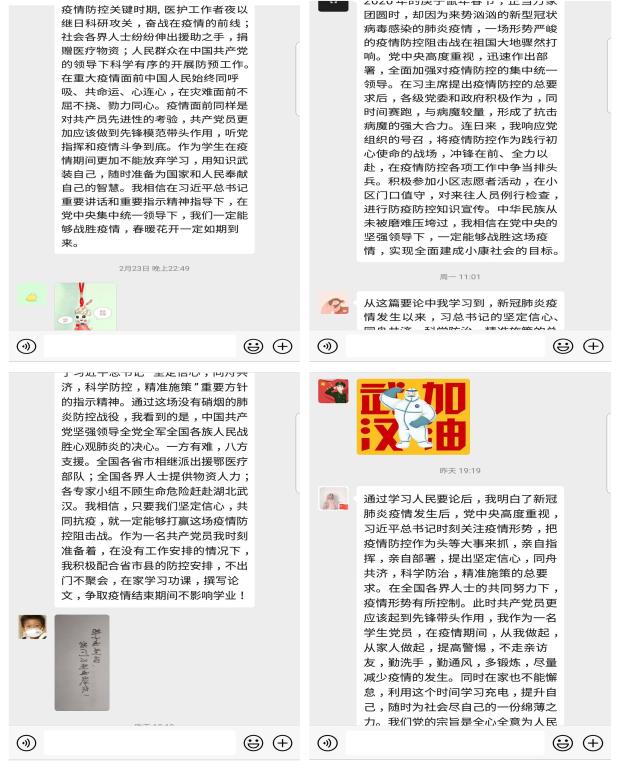 2月27日研究生党支部集中学习了人民网上一篇名为《深入理解和贯彻疫情防控工作总要求》的人民要论,深刻认识到疫情防控工作的重要性和打赢这场“抗疫战争”的必然性。支部还邀请在防疫期间担任小区志愿者的S191601班党员许二超和大家交流分享,讲述他自己的抗疫故事。