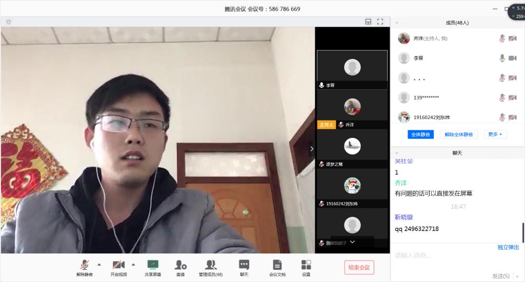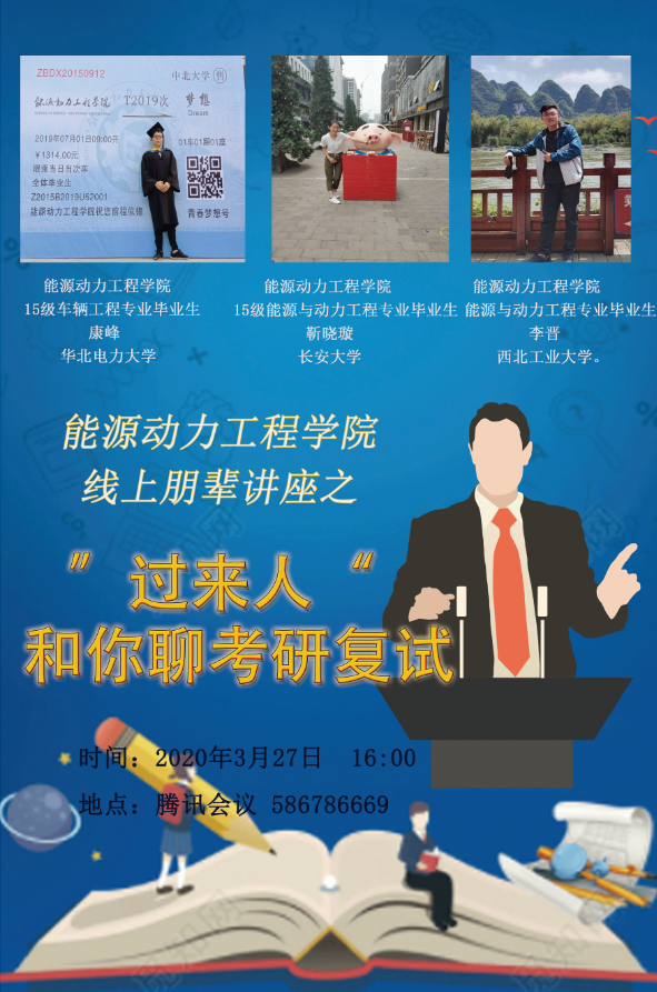 为在疫情期间加强对2020届毕业生考研复试与调剂的指导与帮扶,同时加强校友和母校之间的联系,2020年3月27日下午16:00,能源动力工程学院邀请2019届3名优秀校友通过网络平台开展考研复试线上朋辈讲座。此次讲座邀请到目前就读华北电力大学的康峰、长安大学的靳晓璇、西北工业大学的李晋3名优秀校友担任主讲嘉宾,能源动力工程学院党委副书记任雁及65名学生参加了讲座。