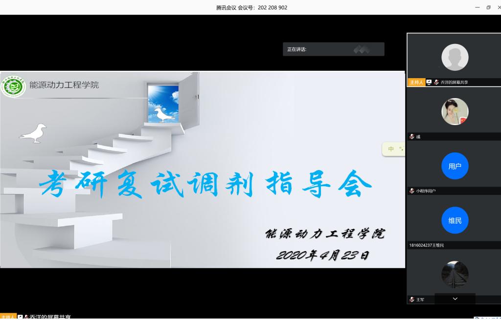 为确保2020届毕业生升学工作顺利进行,同时精准服务到每一名需要考研复试的毕业生,2020年4月23日下午,能源动力工程学院召开考研复试调剂线上指导会。学院院长刘汉涛、院党委副书记兼副院长任雁、科研与学科发展科科长王军,以及60余名同学参加了此次会议。
