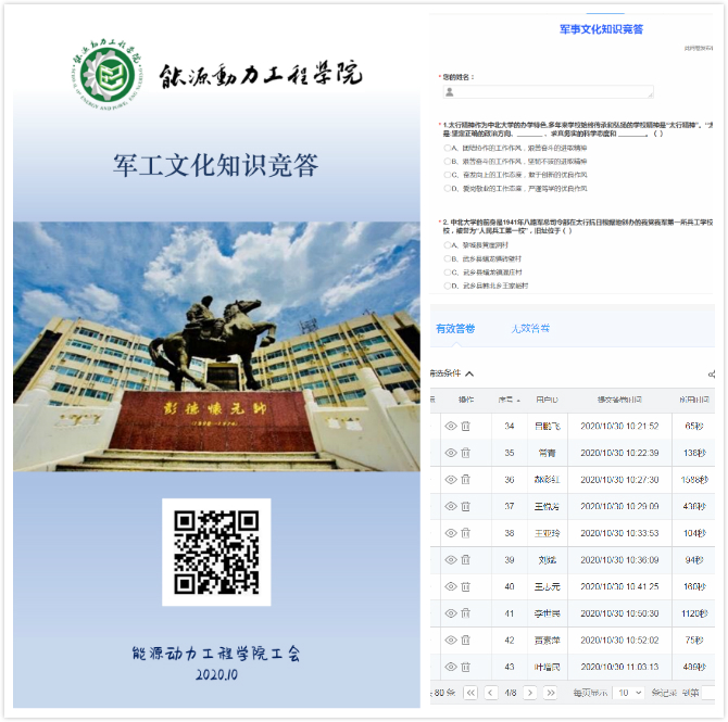 2020年10月是我校“军工文化月”,为强化军工文化主题教育,浓郁学院军工文化氛围,传承“人民兵工第一校”的红色基因,能源动力工程学院工会举办“弘扬军工文化,传承红色基因”网络知识竞答,号召广大教职工秉承太行精神,践行致知于行,铸魂固本、立德树人。全院61名教职工通过在线答题的方式参加了此次知识竞答活动。