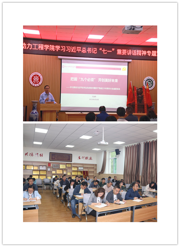 根据《中北大学学习习近平“七一”重要讲话精神宣讲安排》(党史办[2021]18号)文件要求,2021年9月28日上午,能源动力工程学院在诚学楼115会议室举行党史学习教育第三轮专题宣讲,本次宣讲邀请到校宣讲团成员马克思主义学院思政课骨干教师王建军老师担任主讲嘉宾。本次宣讲活动由院党委副书记任雁主持,学院全体教工党员参加了学习。