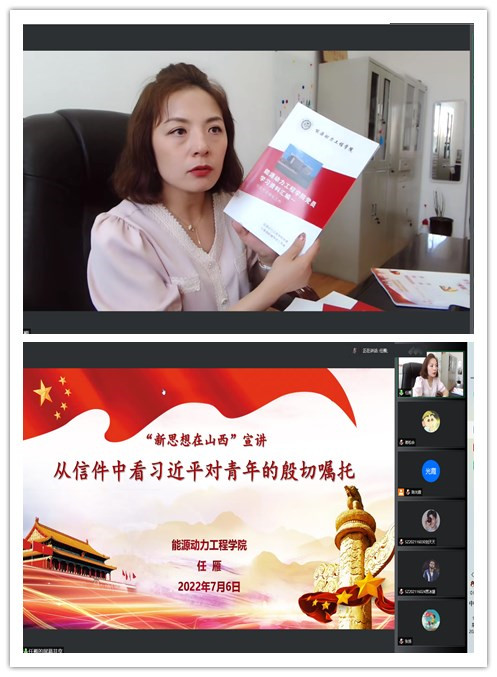 为庆祝中国共产党成立101周年,2022年07月06日上午,能源与动力工程学院党委开展“新思想在山西”宣讲活动。本场宣讲由院党委副书记任雁同志担任主讲嘉宾,为全体学生党员带来主题为《从信件中看习近平对青年的殷切嘱托》的党课。各学生党支部书记和全体学生党员80余人通过腾讯会议在线参加了本次学习。