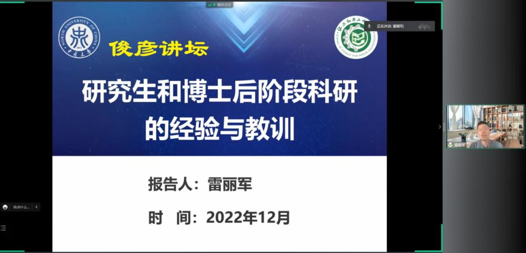 为了提高研究生的专业素养,帮助研究生养成良好的科研习惯、明确学习规划,能源与动力工程学院于2022年12月3日上午10:00在线上成功举办了第20221601期俊彦讲坛,本次讲坛以《研究生和博士后阶段科研的经验和教训》为主题,来自各学院的300余名研究生在线聆听了此次讲座。本次讲坛邀请到能源与动力工程学院新入职教师雷丽军老师担任主讲人,学院党委副书记兼副院长任雁主持。