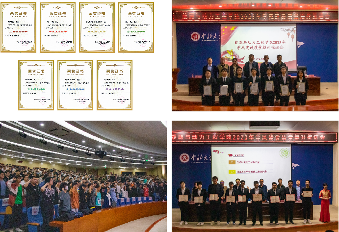 大会在庄严的国歌声中拉开帷幕。副院长张翼从考研情况、英语四级通过率、挂科率、科技创新等四个方面对2022年学风建设工作进行了回顾和总结。车辆工程系主任杨世文、能源工程系主任王强、能源材料系党支部书记王立勇分别宣读了《能源与动力工程学院关于表彰“七色光”育人标兵的决定》、《能源与动力工程学院关于表彰2022年秋季学期成绩年级前三名班级的决定》、《能源与动力工程学院关于表彰四级通过率前三名的决定》。主席台领导为获奖集体和个人进行了颁奖。