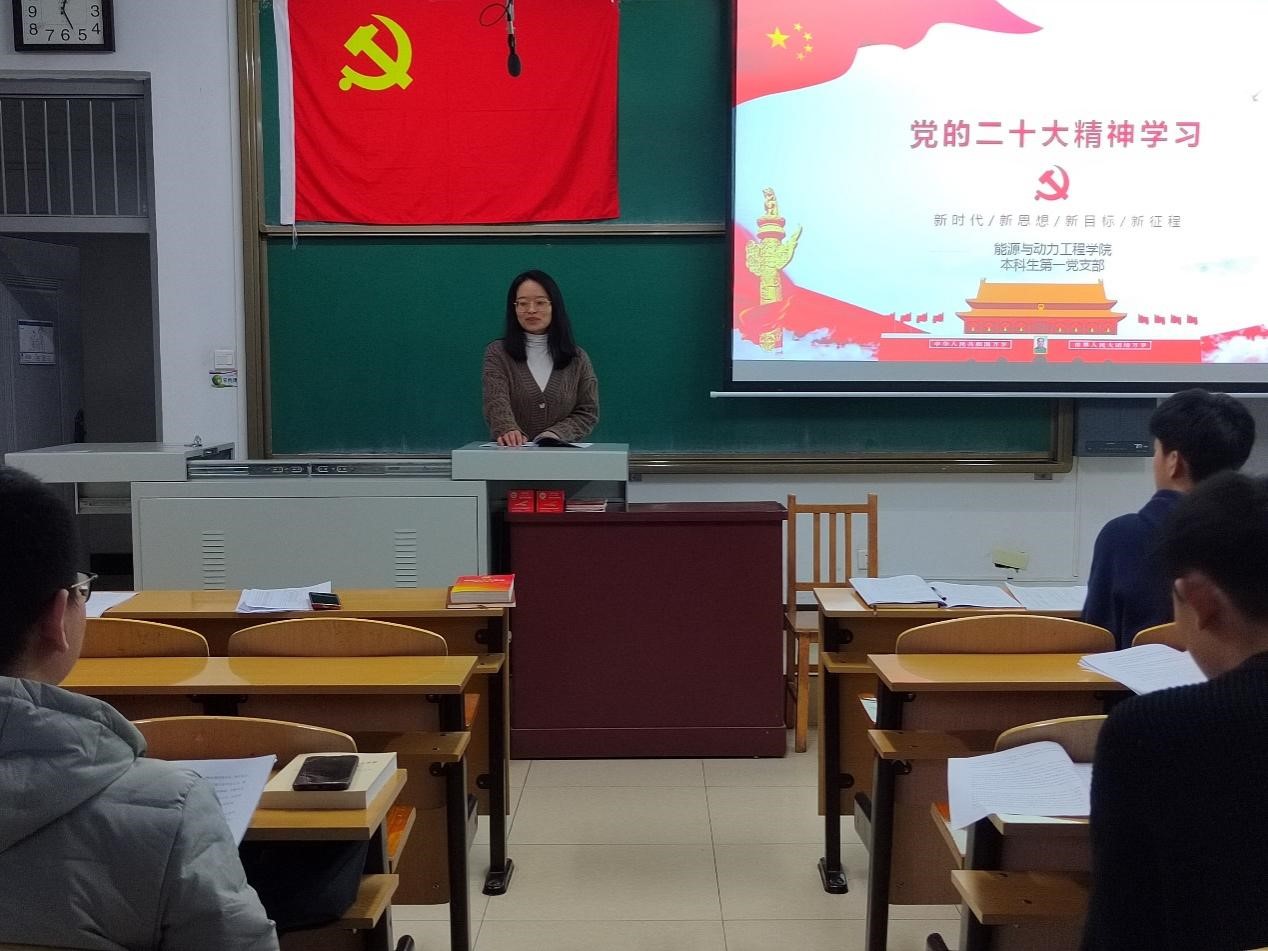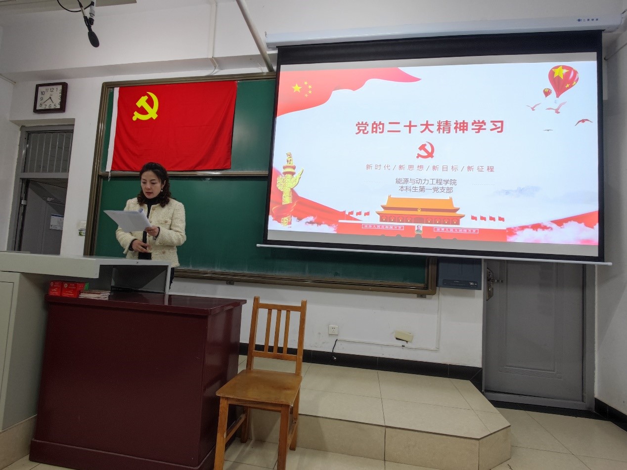 2023年4月23日下午,能源动力工程学院党委副书记兼副院长任雁老师,本科生第一党支部书记李晓彧老师在15107为支部全体党员开展“党的二十大精神学习”主题活动。任雁老师带领支部党员领读中国共产党第二十次全国代表大会的报告,同志们更加深刻的理解了二十大的内容。