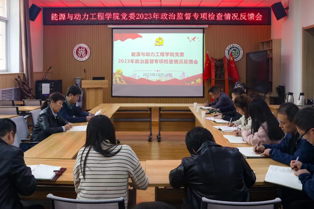 2023年10月19日下午,能源与动力工程学院党委在诚学楼115会议室召开2023年政治监督专项检查情况反馈会。第一监督检查组杨晓东、吴晓云出席会议,学院党委委员、领导班子成员、各党支部书记、科级干部参加会议,院党委书记顾宁同志主持会议。