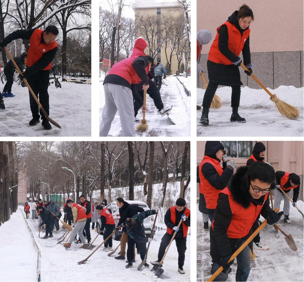 学院党员领导干部带头,60余名师生在院楼门口集合,吹响清雪除冰的冲锋号。早晨室外的温度已低至零下11度,再加上呼啸的寒风,天气异常寒冷。但大家不畏严寒,身着红色志愿者马甲,手持扫帚、铁锹等工具,全力投入到扫雪工作中。他们用扫帚将积雪扫开,然后用铁锹将冰块和雪块铲除,白雪皑皑中的“一抹红”构成了这个冬日雪景中最亮丽的风景线,筑起了一道校园安全的红色防线。大家面对强降雪带来的挑战,以高效的协作,全力以赴地完成了任务,为师生清扫出一条“出行安全路”。