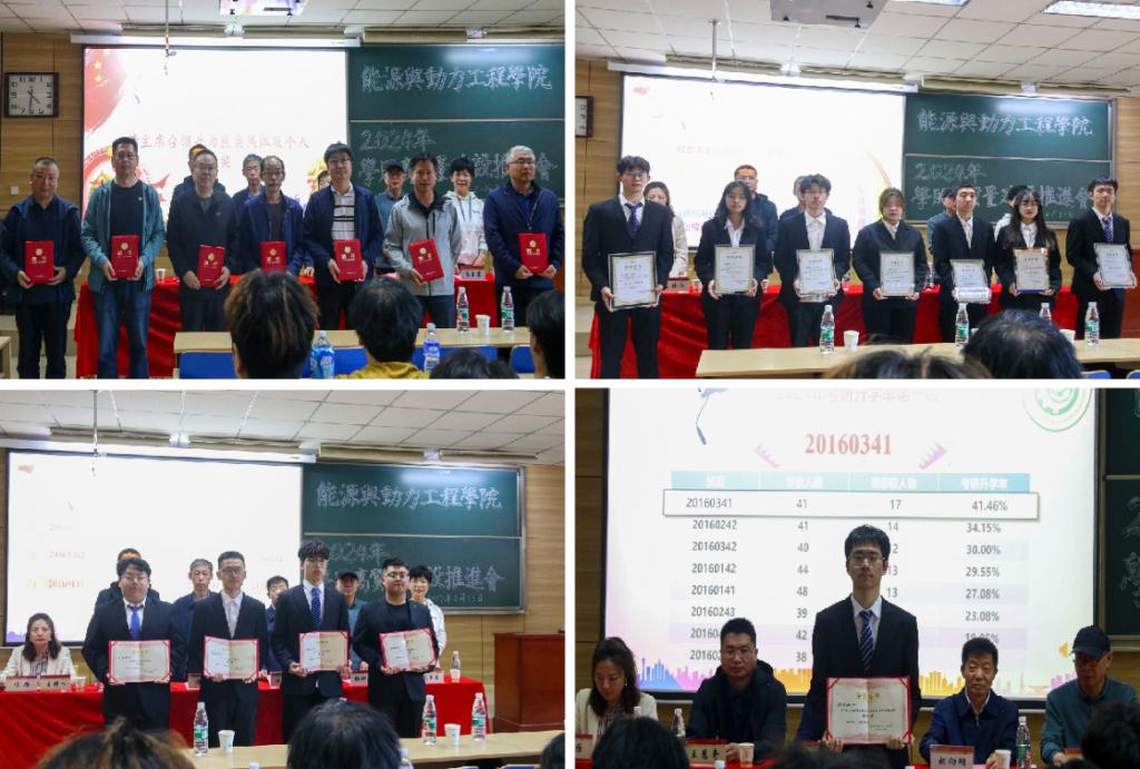 在庄严的国歌声中,大会正式拉开帷幕。教学副院长张翼从四级通过率、挂科率、考研率以及科技创新四个方面对学院2023年的学风工作进行了总结与回顾,对过去一年里取得的成绩表示充分肯定。车辆工程系副主任高玉霞宣读《关于能源与动力工程学院人生导师的聘任决定》、《能源与动力工程学院关于表彰“七色光”育人标兵的决定》。能源材料系主任王慧奇宣读《能源与动力工程学院关于表彰2023年秋季学期成绩年级前三名班级的决定》、《能源与动力工程学院关于表彰四级通过率前三名的决定》。主席台领导为安全保卫部人生导师颁发聘书,并为获奖集体及个人颁奖。
