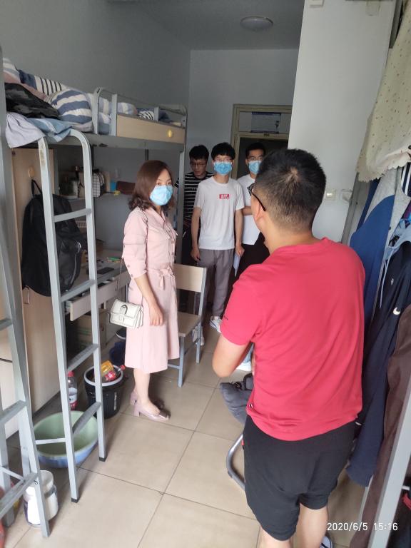 为及时了解研究生返校后的生活情况,确保疫情防控工作落到实处,2020年6月9日下午,能源动力工程学院党委副书记任雁、副院长胡胜亮、科研与学科建设科科长王军和辅导员祁亚萍一行4人来到宿舍进行走访和安全检查。