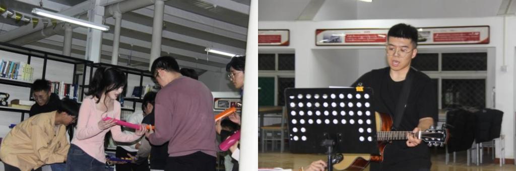 本次联谊活动以互动游戏、节目表演等为主要内容,活动以分组的形式开展,将不同学院、不同年级的同学合理地分为6个大组,旨在为我院研究生提供一个展现自我、结识好友的平台。活动开始后首先由陈亮、王松两位同学的《只想把你偷偷藏好》歌曲以男女对唱的形式完成热场环节;随后,活动进入了“谁是卧底”、“心情积木”等游戏环节,过程中充分展现了活动的互动性、趣味性以及同学们的参与积极性和团队合作精神。期间,穿插了陈亮同学的《看月亮爬上来》等歌曲独唱节目,营造了活动的轻松欢快氛围,最后活动在赵晨阳和宋涛的吉他弹唱曲目《New Boy》中画上圆满句号,充分体现青年一代的蓬勃朝气和对未来的憧憬向往,同时也呼应了联谊活动的青春主题。