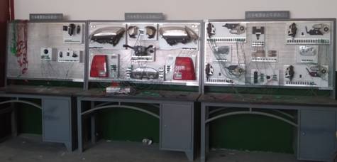 汽车电器实训区拥有启动系统实验台、充电系统实验台、柴油车电器实训台、汽车电器综合实训台、发动机点火系统示教板、汽车电子电器万能检测试验台、发动机电器实训台等设备,总价值40多万元。可开展汽车供电系统、起动系统、点火系统、汽车电器、燃油供给系统、汽车故障诊断与检测等实验项目。服务于汽车电器、汽车故障诊断、发动机电控技术等课程实验教学任务。