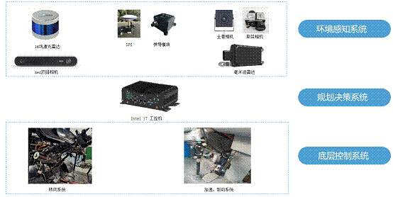 纯电动无人驾驶汽车实验平台在电动车基础上进行底盘电控改装,匹配了环境传感器,诸如GPS、激光雷达、毫米波雷达、摄像头等,结合多传感器感知与数据融合,分析车辆所处环境状态,通过车载计算机进行路径规划与智能决策,控制无人车电控底盘系统工作,实现自主导航、主动避障及初级自动驾驶功能。目前已具备环境传感器对道路行人,车道线,交通标志等信号的识别与车前障碍物距离的精准探测,对摄像头RGB图像深度信息与雷达3D点云信息进行深度融合后,可通过底层控制模块实现自主导航与自动驾驶。